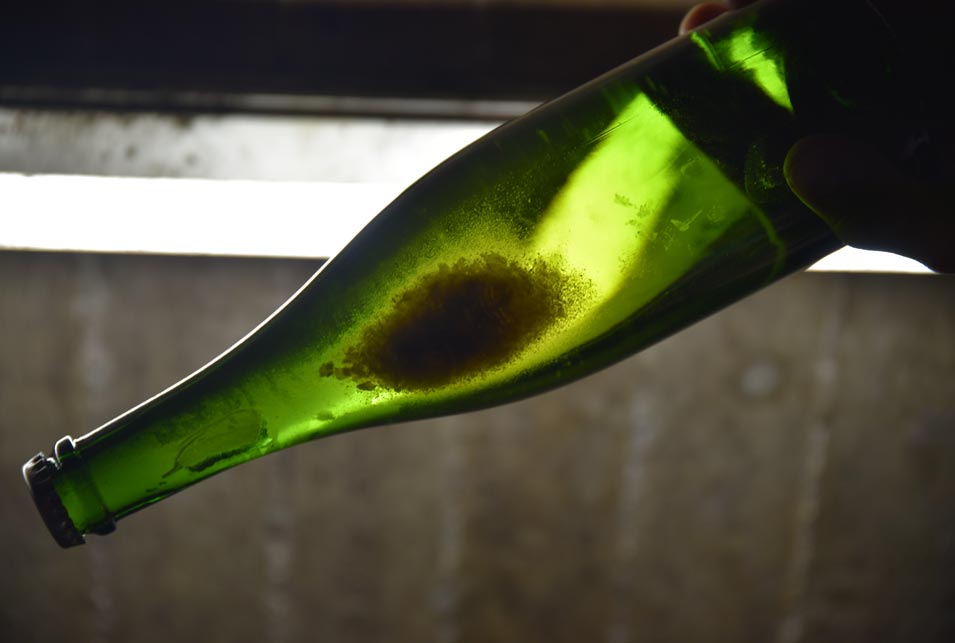 Am Ende der neunmonatigen Lagerzeit muss die Hefe in den Flaschen wieder aufgeschüttelt werden. Dazu werden die Flaschen kopfüber in die sogenannten Rüttelpulte gesteckt. Ab jetzt wird jede Flasche 30 bis 50 Mal gerüttelt, womit das tägliche Drehen der Flasche gemeint ist. Durch diese Bewegung rutscht die Hefe in der Flasche nach und nach in den Flaschenhals und sammelt sich in der Nähe des Kronkorkens.